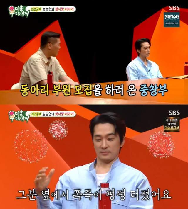 特别是宋承宪在这一天公开了自己过去的恋爱故事,宋承宪表示:“当我20多岁的时候,我向东烨提出了约会建议,(我的哥哥)告诉我,如果我真的喜欢那个人,就躺在她家房子前面,我哥哥真的很喜欢一个人,无缘无故地搬到了那个女人的房子附近,我以为那不是申东烨,其实我也曾经这样过,我假装在房子前面熬夜”。