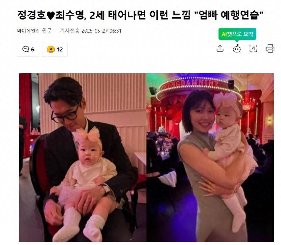 大家好呀,这里是你们的小娱~今天咱们来聊聊郑敬淏和崔秀英这对甜蜜情侣的最新近况。据韩国媒体5月27日报道,郑敬淏和崔秀英两人一同出席了熟人的婚礼,现场互动温馨有爱,尤其是他们抱着孩子的模样引发网友热议,不少人直呼:”这是在提前练习当爸妈吗?”