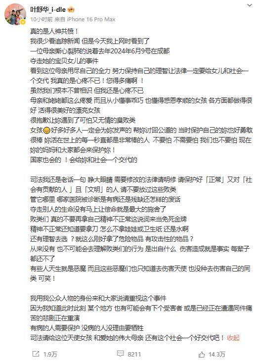 今日凌晨,女团(G)I-DLE成员叶舒华突然在微博发长文,为家门口遇难案女生发声,瞬间引爆热搜!这位平时以”佛系”著称的中国台湾妹子,这次却用最刚的态度喊话:”精神病不是免死金牌”。